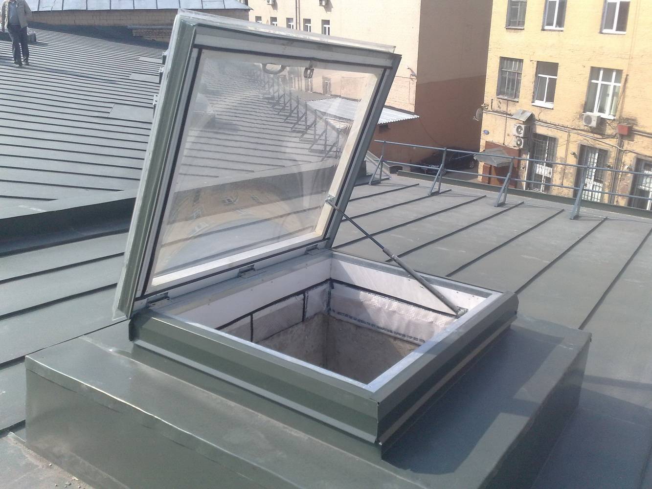 Другим видом люка, который используется на кровлях является эксплуатационный. В отличие от предыдущего, его крышка не имеет стеклопакета и наглухо закрывает отверстие. Преимуществом такого решения является наличие встроенной лестницы, которую не придется носить за собой. Технологические люки применяют в зданиях, которые имеют несколько этажей, а также плоскую крышу. Такие люки также поставляются в собранном виде, что упрощает их установку на кровлю. Под заказ можно изготовить люк любых требуемых размеров и форм. Такие люки предусматривают необходимость утепления, а также наличие антикоррозионного слоя, который предотвращает разрушение от воздействия погодных факторов. На частных домах такой люк смотреться не эстетично, это можно считать недостатком такой конструкции.