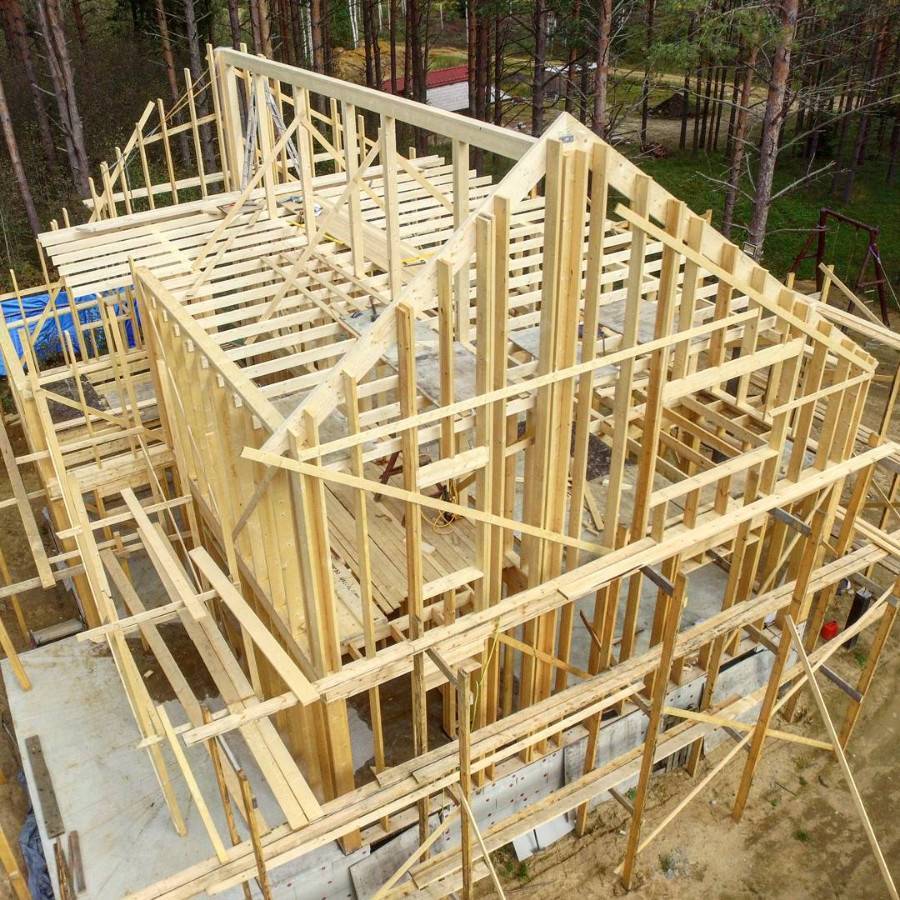 Технология сборки классического каркасного дома предусматривает использование древесных материалов, а именно бруса 10 на 10 см и обрезной доски. Если запланирована мансарда, то стоит увеличить толщину используемого бруса.