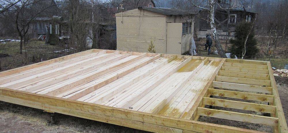 - После того как каркас готов, можно приступать к настилу пола. Сначала на брусья стелется черновой пол. Для него используется самая дешевая не обрезная доска. Сверху укладываются лаги на расстоянии друг от друга – 60 см. Между ними укладываются теплоизоляционные полистирольные плиты, сверху гидроизоляционная пленка. Затем укладываются доски чистового пола, которые желательно пропитать средствами от влияния сырости, насекомых и грызунов.