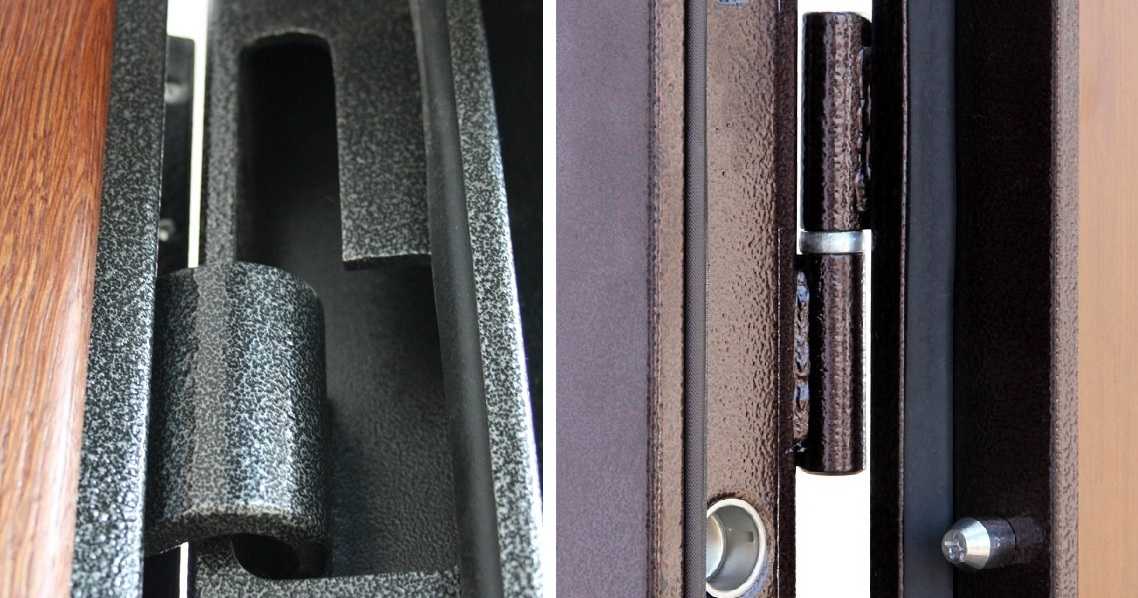 Срезать петли открытого типа не так просто. Кроме этого все двери с таким видам петель оснащаются противосъемными штырями, которые не позволят снять двери даже при срезанных петлях. Поэтому тип петель никак не будет влиять на взломастойкость двери. Гораздо легче будет вскрыть замок, чем создавать столько шума срезая петли.