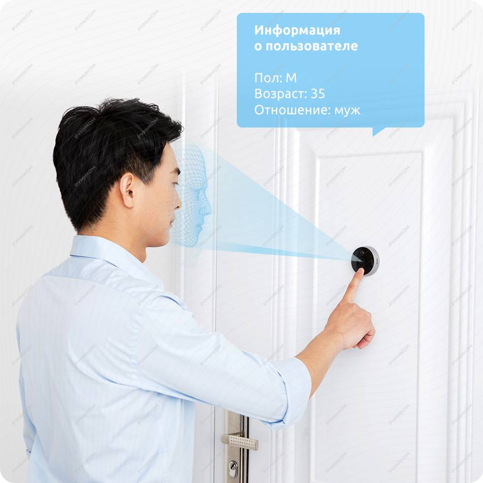 Работает совместно с приложением Mi Home. На самом глазке установлен звонок. При нажатии, на который, изображение автоматически выводится на планшет или телефон. Умный видеоглазок оснащен искусственным интеллектом, который обладает функцией распознавания лиц. При установке дополнительно замка Loock, дверь может открываться автоматически.