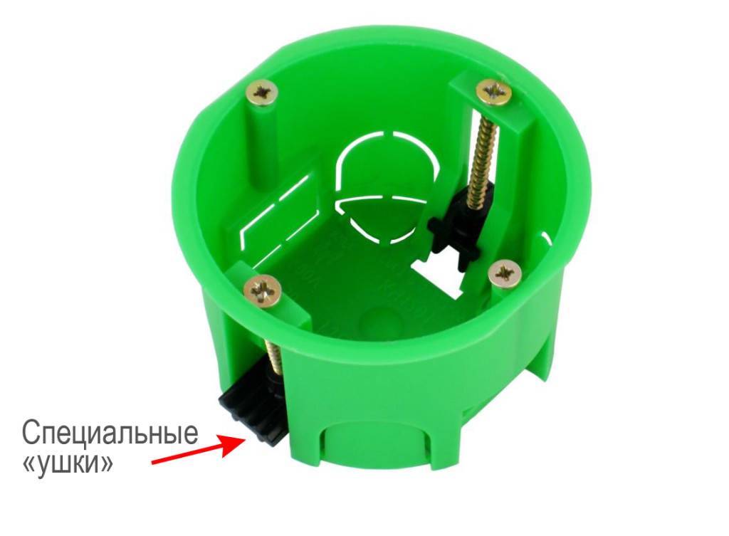 Коробочка для гипсокартонного листа включает в себя два вспомогательных элемента: первый – это упор, которой по форме является кольцевым выступом вдоль всего диаметра – он предотвращает обвал коробки внутрь стенки, второй, специальные зажимы, расклинивающие наряду с упором коробку посреди отверстия для посадки