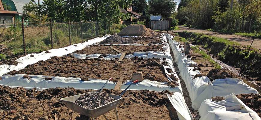- Закладка дренажной системы (если ее еще нет). Одна лишь отсыпка не решит проблему лишней влаги. Ее все равно необходимо отводить закрытым или открытым способом, которые описаны ранее.