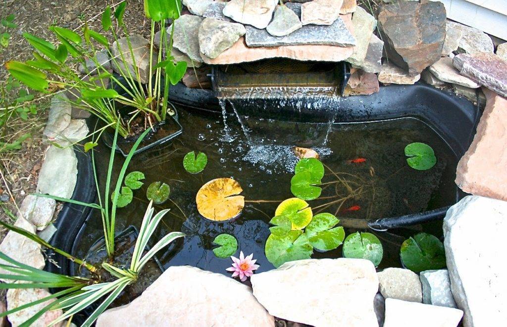 В подобных водоемах используются погружные насосы. Их ставят на дно, установив в корзину с камнями, или просто придавив корпус нескольким валунами. Он забирает воду из емкости, подавая ее в шланг, который крепится к выходному патрубку. Этот шланг и прокладываете к тому месту, откуда будет бежать вода.