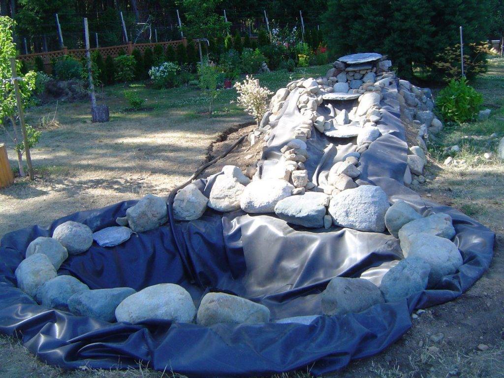 На сформированные уступы расстилается пленка, которая прижимается к руслу камнями. Их нужно раскладывать так, чтобы вода с оного камня падала в на другой, а не на пленку. А потом — дело за оформлением