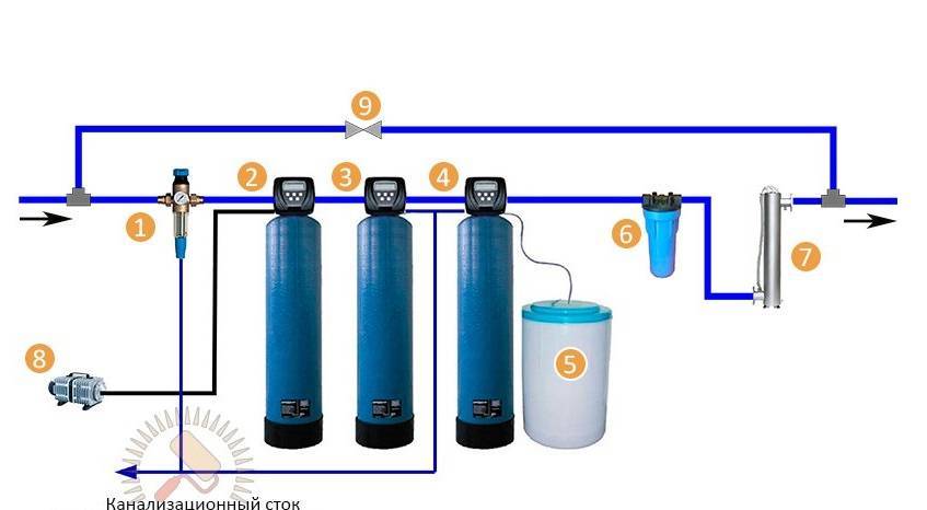 Комплекс водоподготовки. 1. Фильтр грубой очистки. 2. Аэратор. 3. Фильтр обезжелезиватель. 4. Фильтр умягчения. 5. Бак регенерации с солевым концентратом. 6. Фильтр тонкой очистки. 7. Ультрафиолетовый обеззараживатель. 8. Компрессор. 9. Кран линии байпасс
