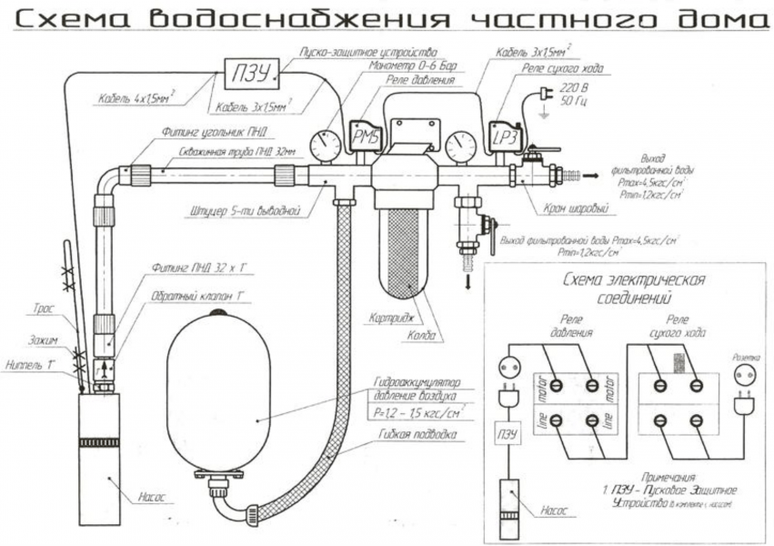 Компоновка гидрооборудования, а также его расположение зависят от выбранной схемы. Как правило, погружной насос, страховочный трос, фильтр грубой очистки, электрокабель и труба для подачи воды размещаются непосредственно в скважине.