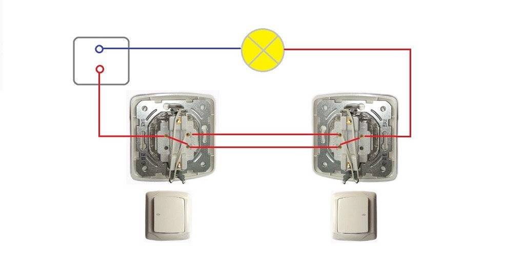 Как видно из схемы, в ней предусмотрено два различных пути прохождения тока через два установленных в цепи выключателя. Питание светильников осуществляется только в том случае, если контакты выключателей замыкают проводники одной и той же ветви. Этого может быть сделано путем изменения положения клавиши любого из них.