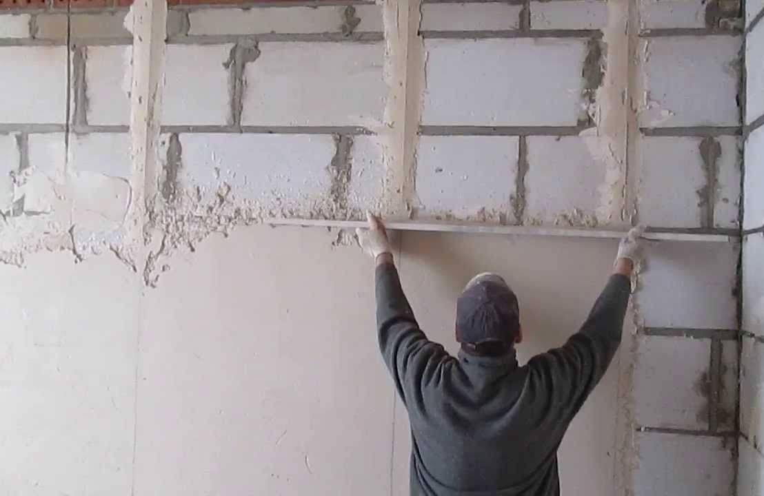 - При помощи правила или длиной жесткой рейки отыскивается самая выпуклая часть стены (нулевая точка) путем прикладывания инструмента и проведением его по поверхности. Нужно прибавить 5 мм для штукатурного слоя.