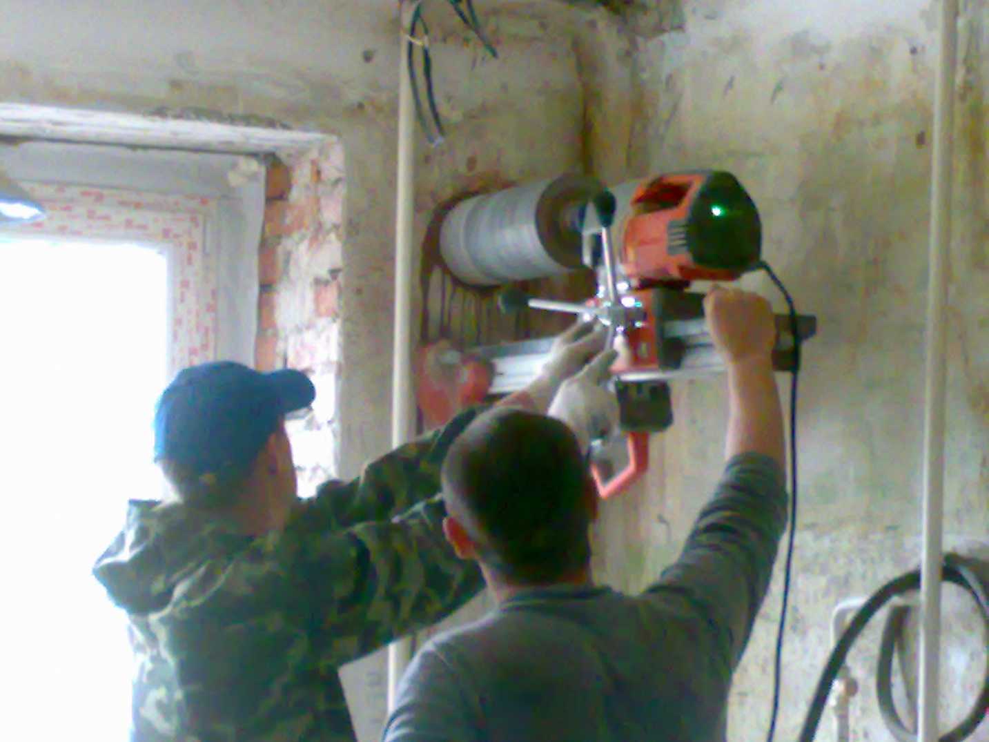 - В стене нужно пробурить отверстие, диаметр которого не превышает 7 см. Отрез трубы по ширине стены рассчитывается с учётом выступа в 1 см с внутренней стороны и положения заподлицо снаружи.