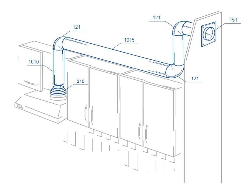 Системы вентиляции от вытяжки до шахты имеют разную геометрию и топологию по причине индивидуальных подходов к планировке кухонь. Поэтому предусмотрены специальные элементы для реализации практически любой конфигурации пластикового короба.