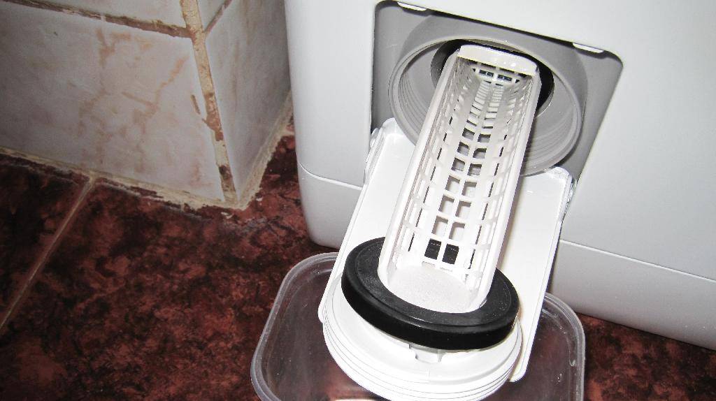 Шаг 1. Слейте с барабана все остатки воды. Для этого на передней панели корпуса откройте нижнюю крышку и достаньте заглушку. Для сбора воды поставьте низкую емкость, в противном случае она прольется на пол. Для полного слива рекомендуется стиральную машину немного наклонить и в таком положении подержать несколько секунд до стекания жидкости.