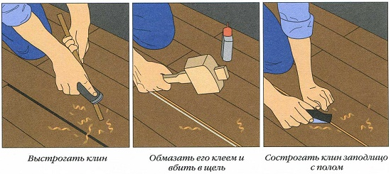 - Эти щели нужно очистить от грязи и пыли, а затем вбить в них деревянный клин, предварительно выстрогав его и обработав столярным клеем. После того как клин будет на месте, понадобится провести шлифовальные работы.