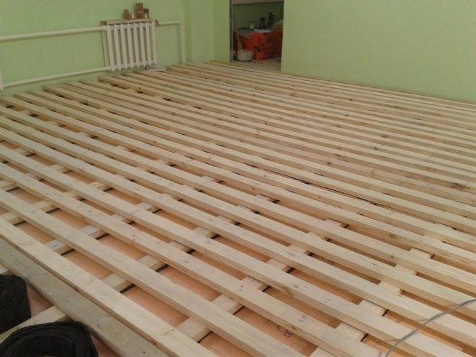 - Если лаги образуют ровную поверхность, чистовой пол можно монтировать прямо на них. Однако лучше сделать контробрешетку из тонких реек, размещенных в противоположном балкам направлении.