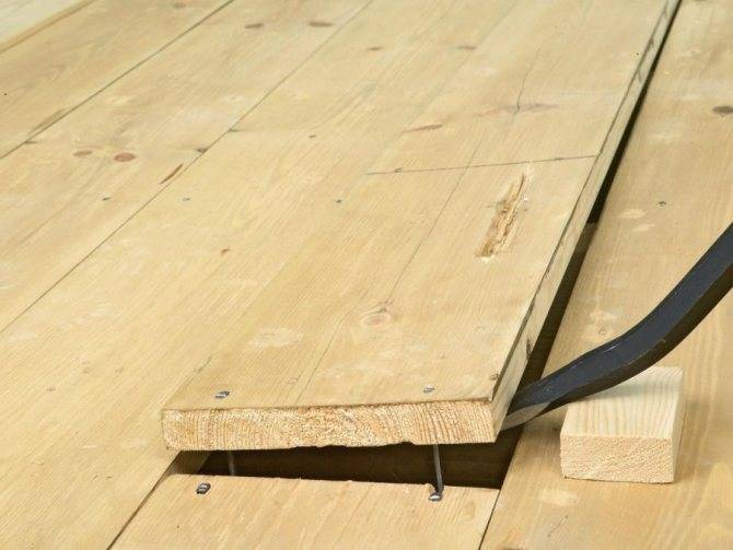 С дощатым полом борются при помощи гвоздодера, молотка и клещей. Главное – подцепить и оторвать первую половицу, после этого процесс пойдет значительно проще и быстрее.
