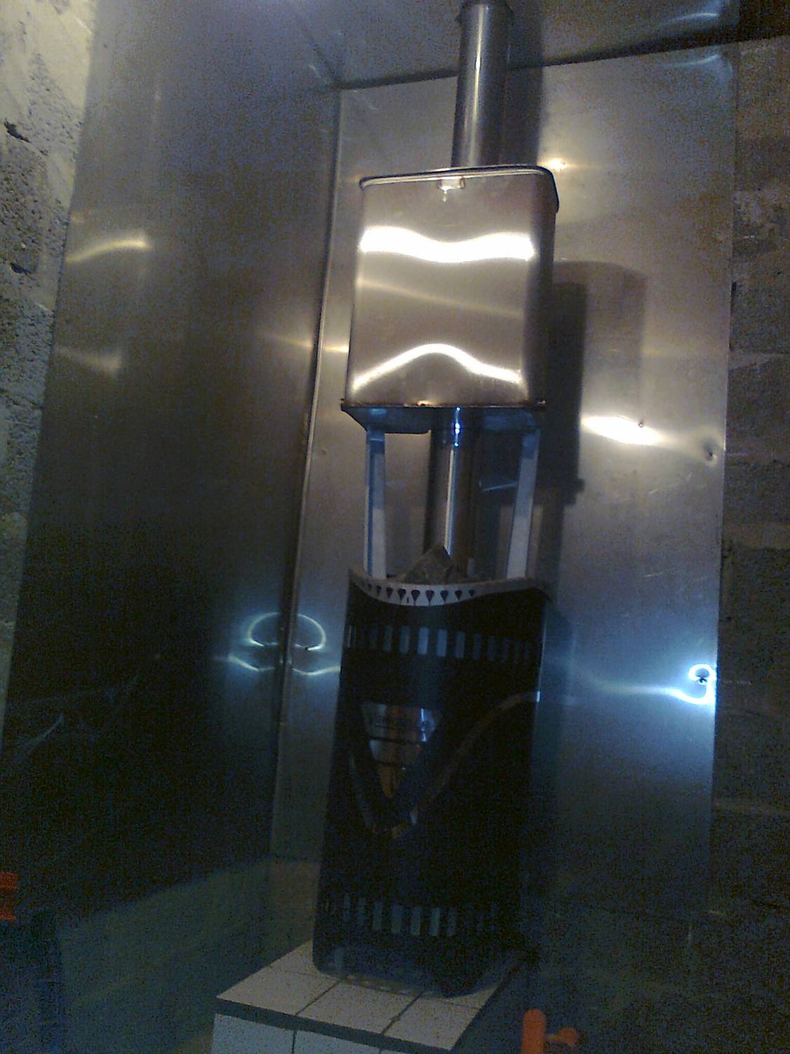Создать такие защитные экраны для банных печей своими руками очень просто. Самый легкий вариант – взять лист металла. Лучше, если он будет полированный – блестящие поверхности хорошо отражают тепловые лучи, т.е. получится, что часть теплового излучения будет «развернута» в помещение, а не поглотиться металлом.