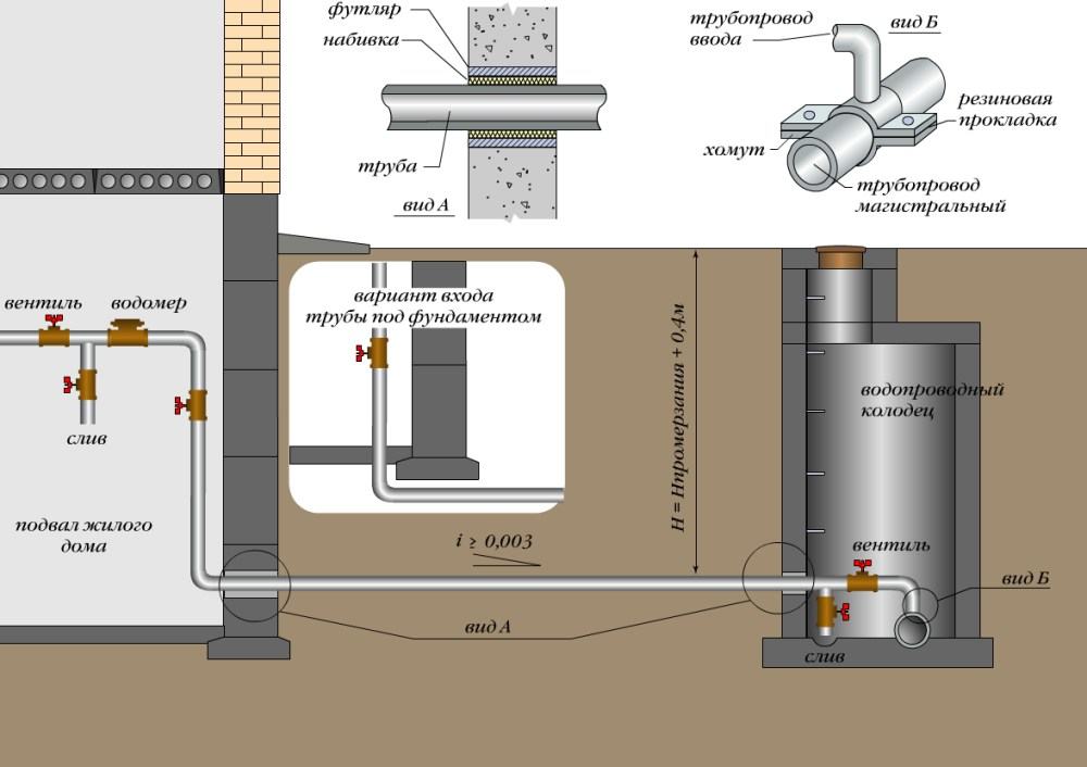 Здесь очень важно качественно герметизировать точку прохода водопроводной трубы сквозь стенку, так как через это отверстие в колодец могут попадать неочищенные воды. Некоторые люди думают, что решить этот вопрос можно с помощью монтажной пены.