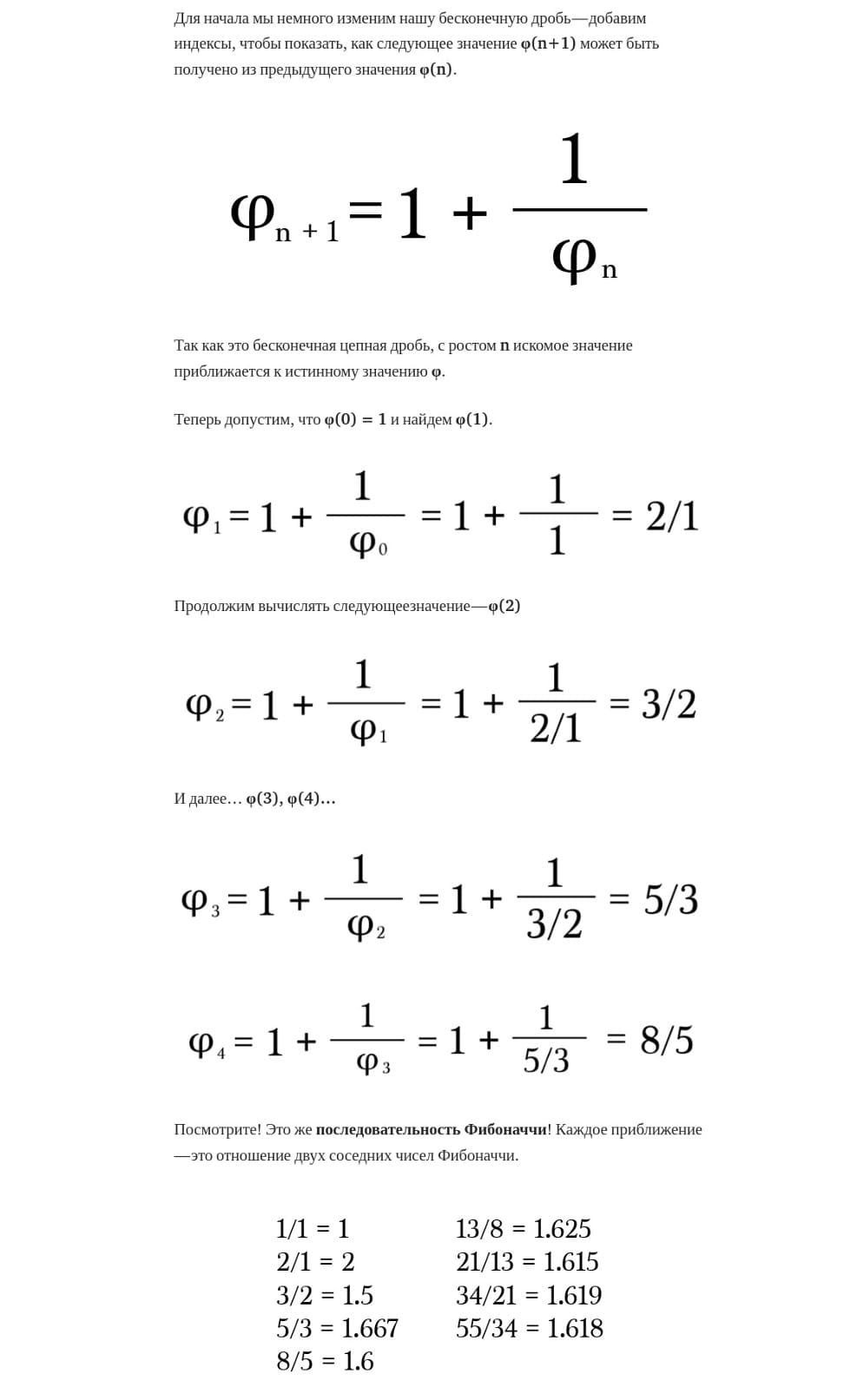 Чтобы увидеть и прочувствовать всю связь числового ряда Фибоначчи и золотого сечения, нужно снова взглянуть на формулы.