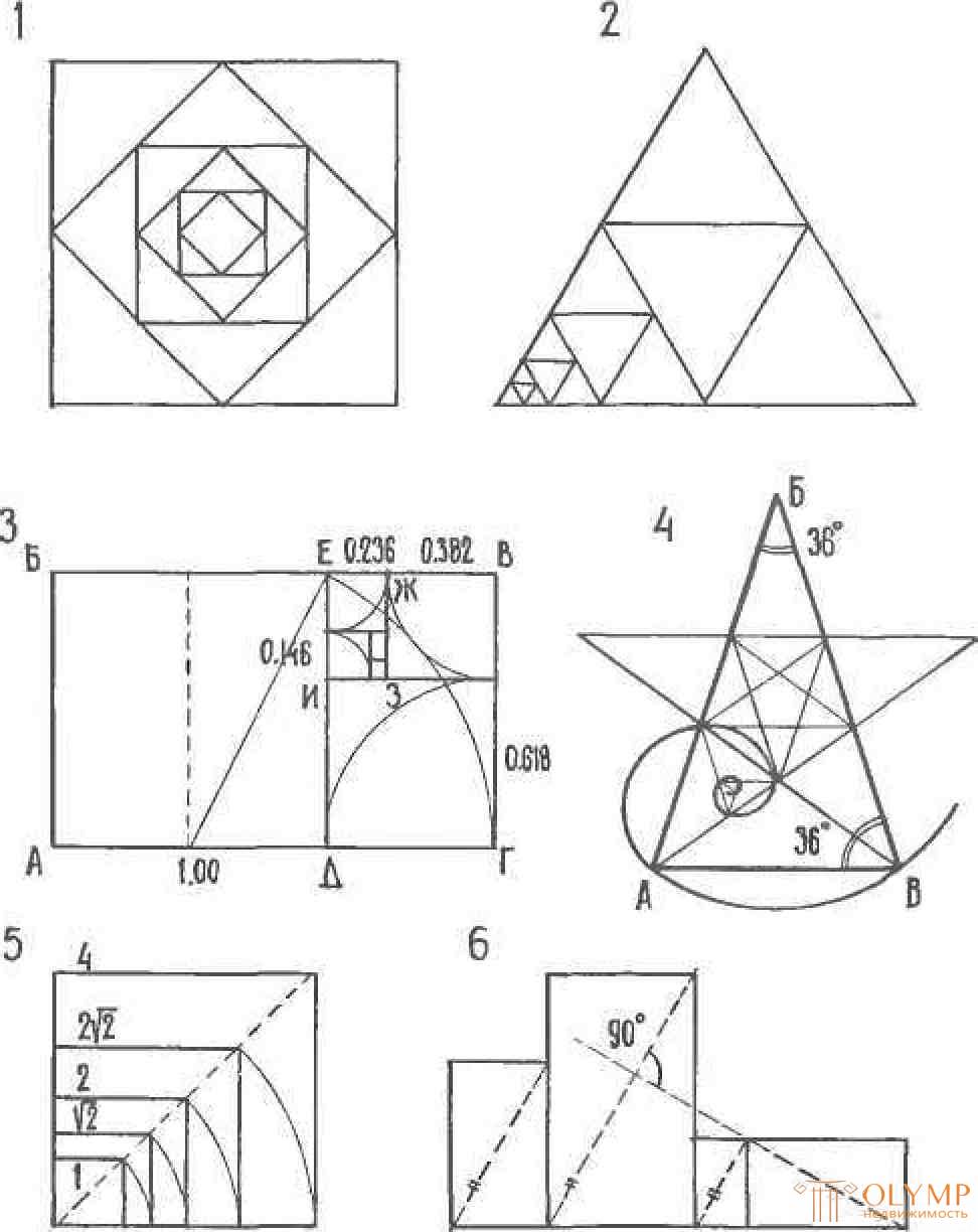Система пропорционирования на основе вписанных квадратов давала геометрический ряд с отношением 1 : √2 , в котором чередовались иррациональные и целые числа (рис. 36 (1)). Эта система использовалась как в Египте, так и в более поздние времена, например в средневековье для построения готических башен. Также в период средневековья широко применялась система вписанных равносторонних треугольников.